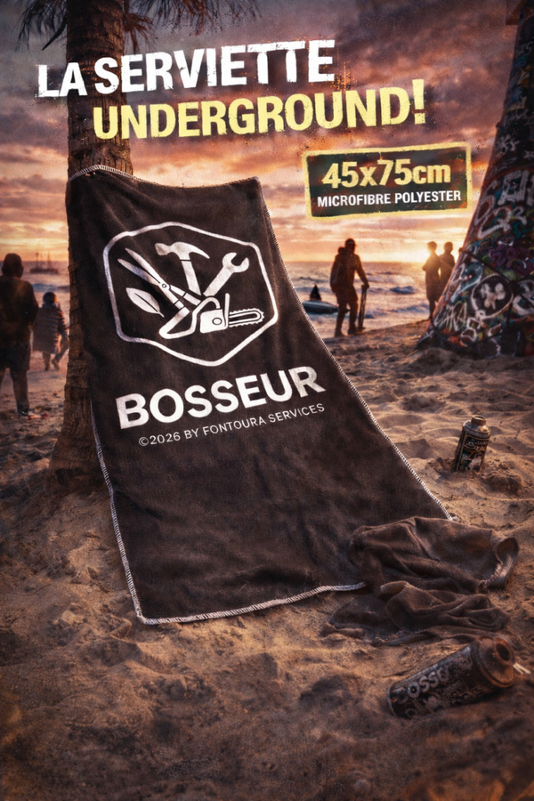 Serviette BOSSEUR en microfibre polyester, idéale pour la plage, le sport, le travail ou les sorties outdoor. ✔ Dimensions : 45 × 75 cm ✔ Matière : microfibre polyester ✔ Légère, douce ✔ Facile à transporter ✔ Couleur : noir/blanc avec logo BOSSEUR blanc