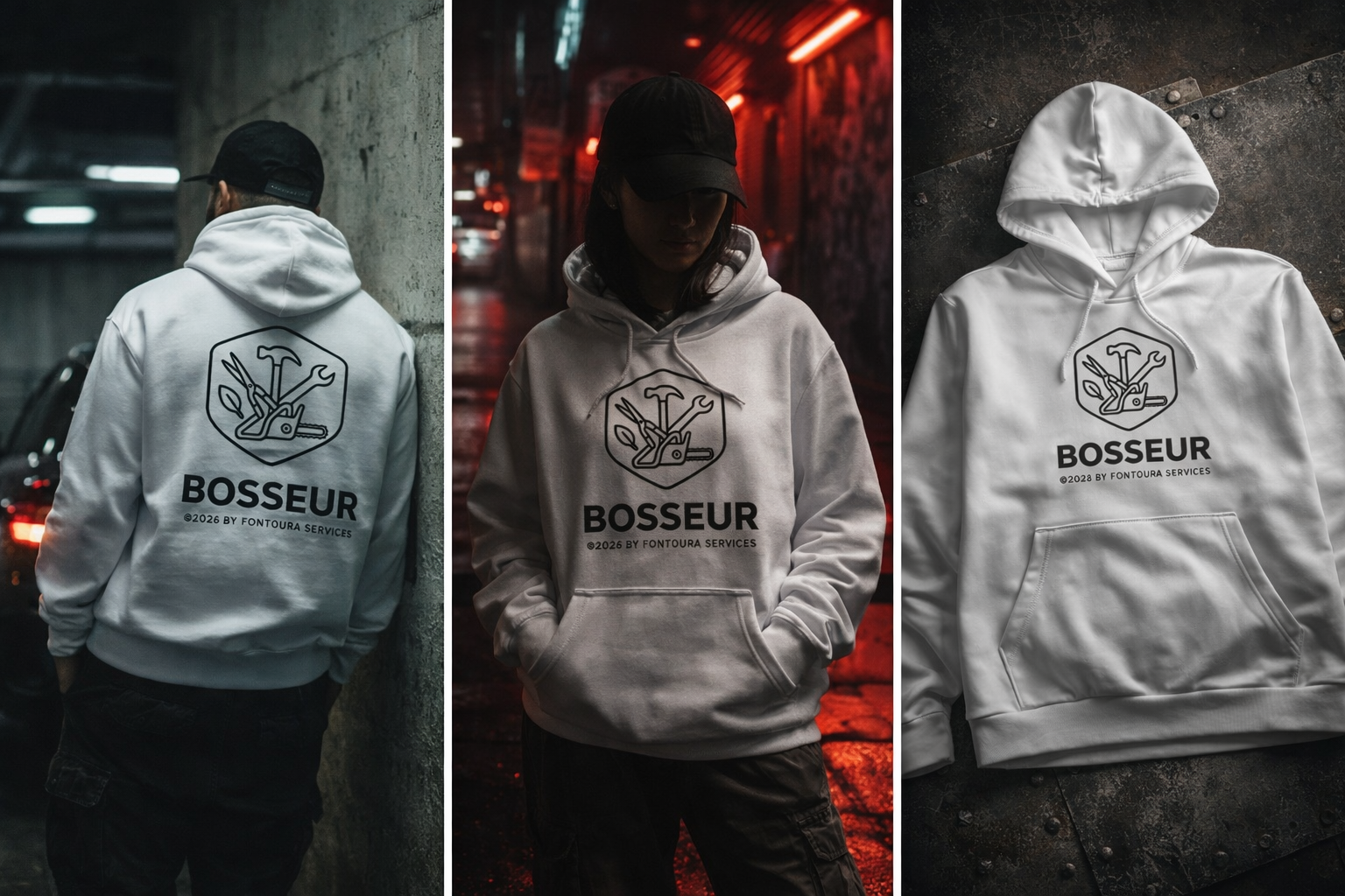 Sweat à capuche BOSSEUR – Blanc Premium (logo poitrine & dos)